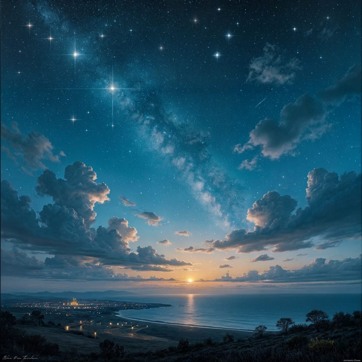 A striking picture of a night sky filled with shimmering stars and soft clouds. Golden city lights glow faintly on the horizon, contrasting with the desolate land and shadowed ocean in this old style oil painting.