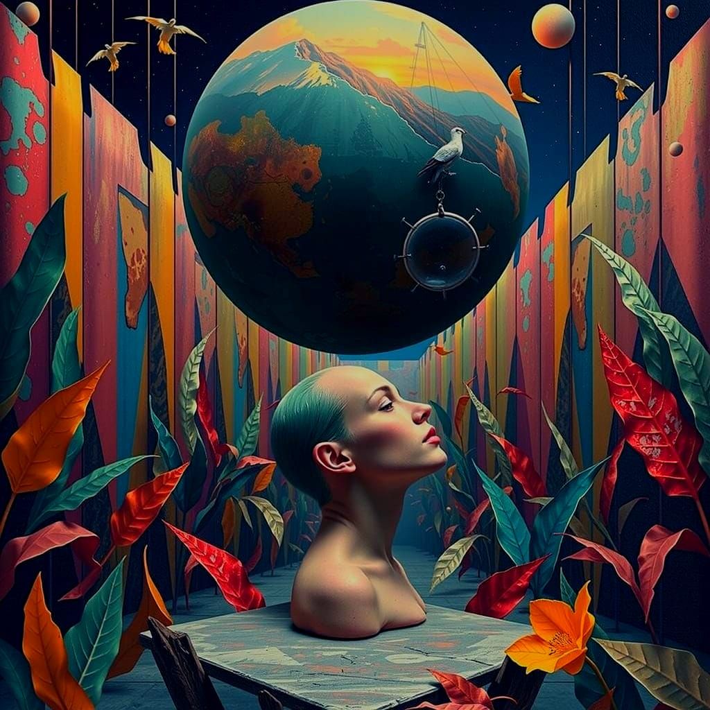 This photorealistic image presents a surreal blend of figures, including a Matador and Harlequin, amidst vibrant green fields and a blue sky. The artwork features intricate cloisonné details and golden leaves, evoking a dreamlike atmosphere.