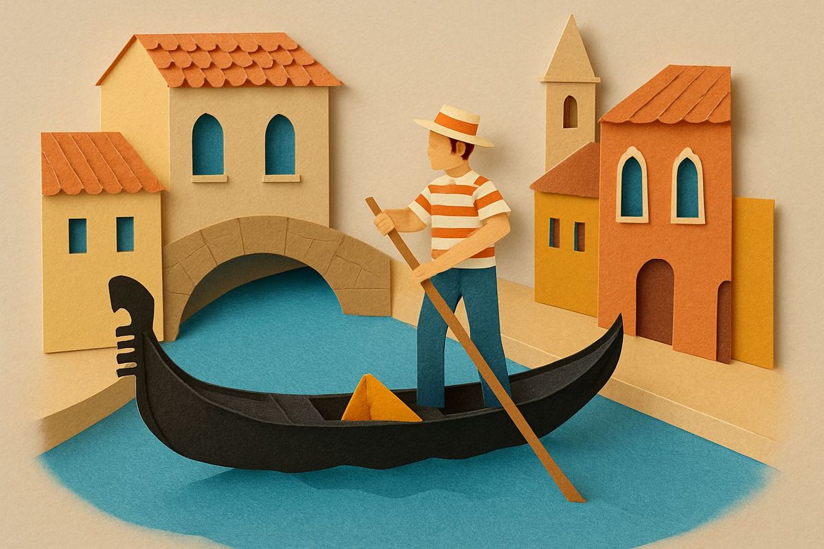 This image shows a paper gondola on a blue canal in Italy. The artwork is in a paper craft style, giving it a whimsical and unique appearance.
