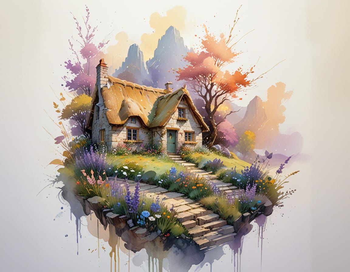 A picturesque stone cottage nestles in a wildflower meadow, bathed in morning light. This image showcases a dreamy, painterly style with pastel colors and delicate watercolor effects, creating a whimsical and enchanting atmosphere.