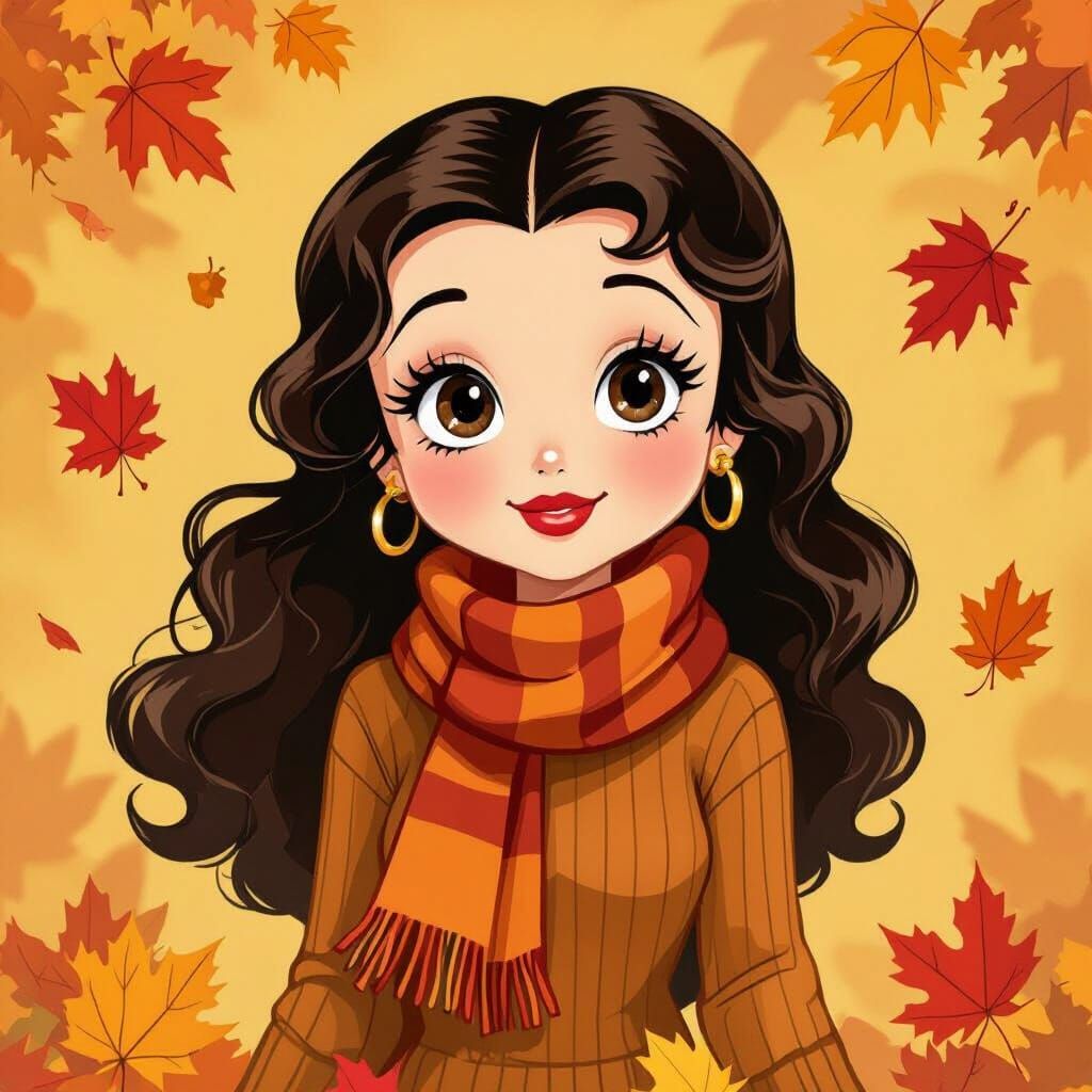 This image shows Betty Boop in a warm sweater and scarf, featuring long brown hair and eyes, amidst autumn leaves. Rendered in a vibrant 1920s cartoon style with bold lines, inspired by classic animation and illustration.