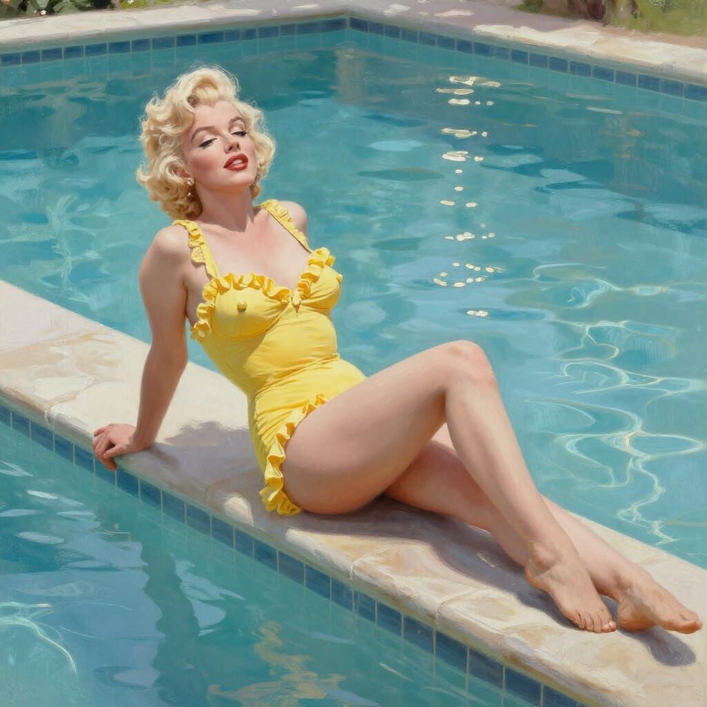 This impressionistic oil painting shows Marilyn Monroe in a ruffled yellow swimsuit by a pool, evoking vintage glamour with soft lighting and elegant lines.