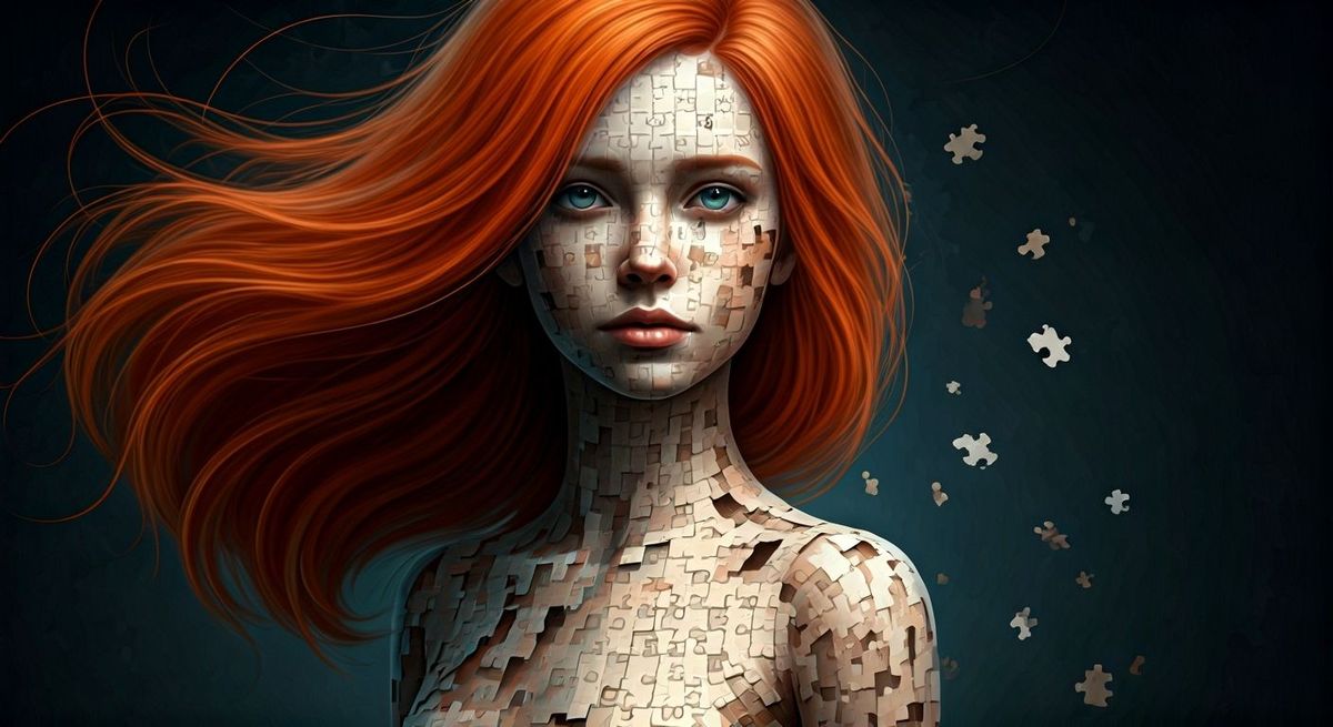 This image shows a red-haired girl whose body is composed of interlocking puzzle pieces, with some pieces missing. The image has futuristic realism and intricate mechanical and atmospheric depth.