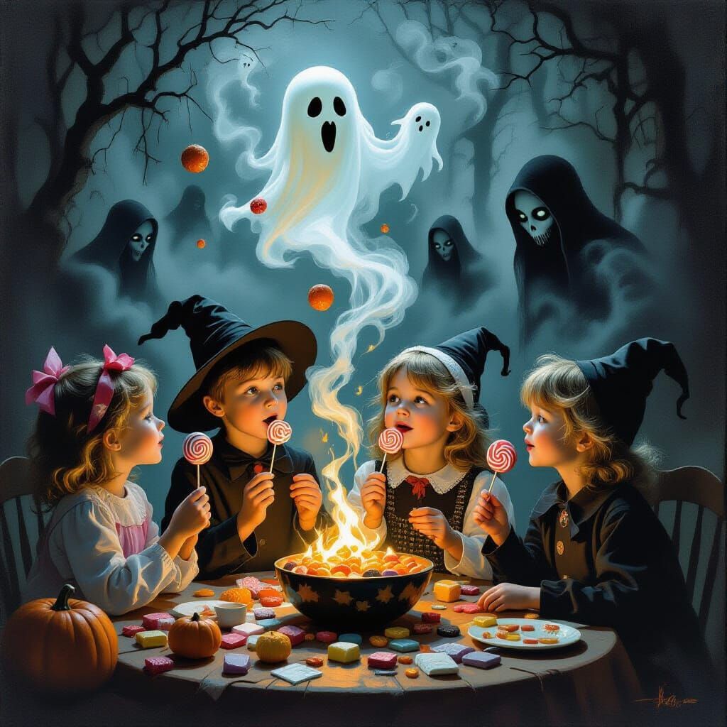 This surrealist oil painting depicts a darkly whimsical Halloween scene. Children encounter eerie visions and shadowy figures as they receive ghostly, melting candies, rendered with dramatic lighting and a spectral palette.