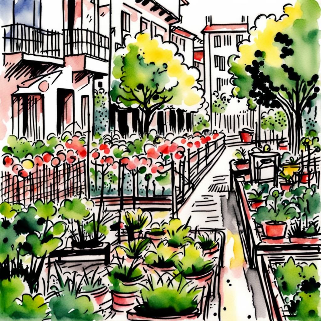 This image shows an urban park scene rendered as a watercolor ink drawing. The artwork captures a garden setting with vibrant colors and delicate details.