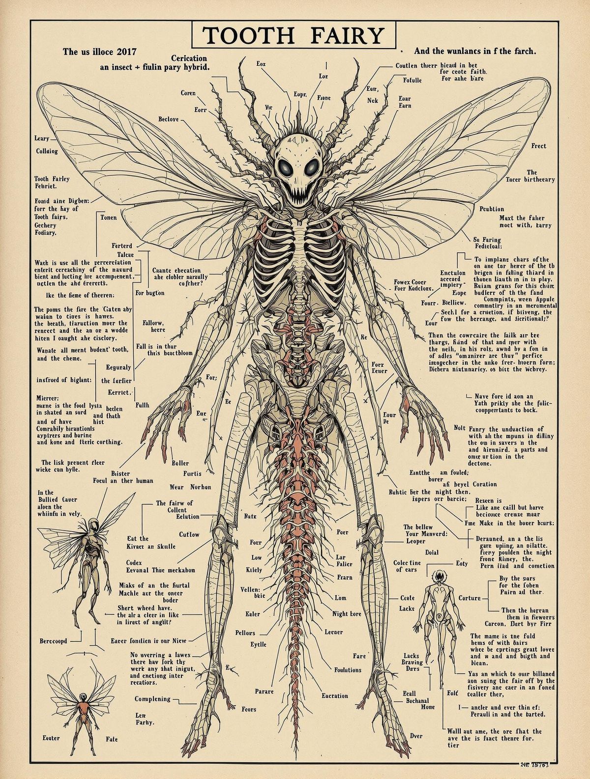 This image shows a parchment-style annotated schematic detailing the biology of a revolting insectoid-human tooth fairy hybrid, presented as a page from a fantastical medical journal.