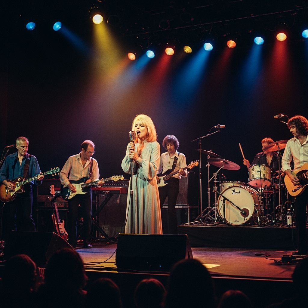 This image captures Blondie performing their hit song "Heart of Glass" live. Debbie Harry commands the stage, embodying late 70s punk and new wave style, with the band in full performance mode under dramatic lighting.