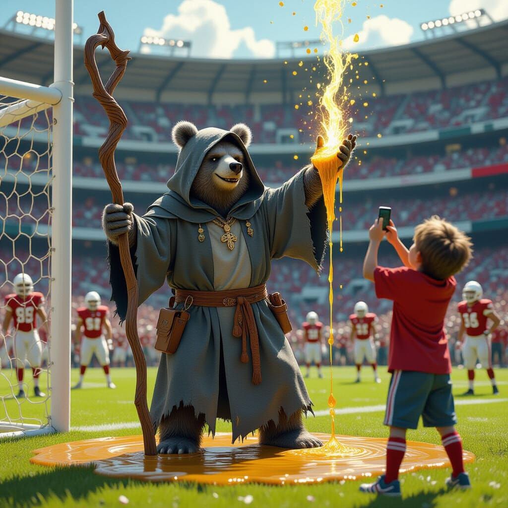 A surreal scene in a football stadium where a wizard bear sprays honey, causing chaos. Features dark fantasy concept art with dynamic lighting and rich colors.