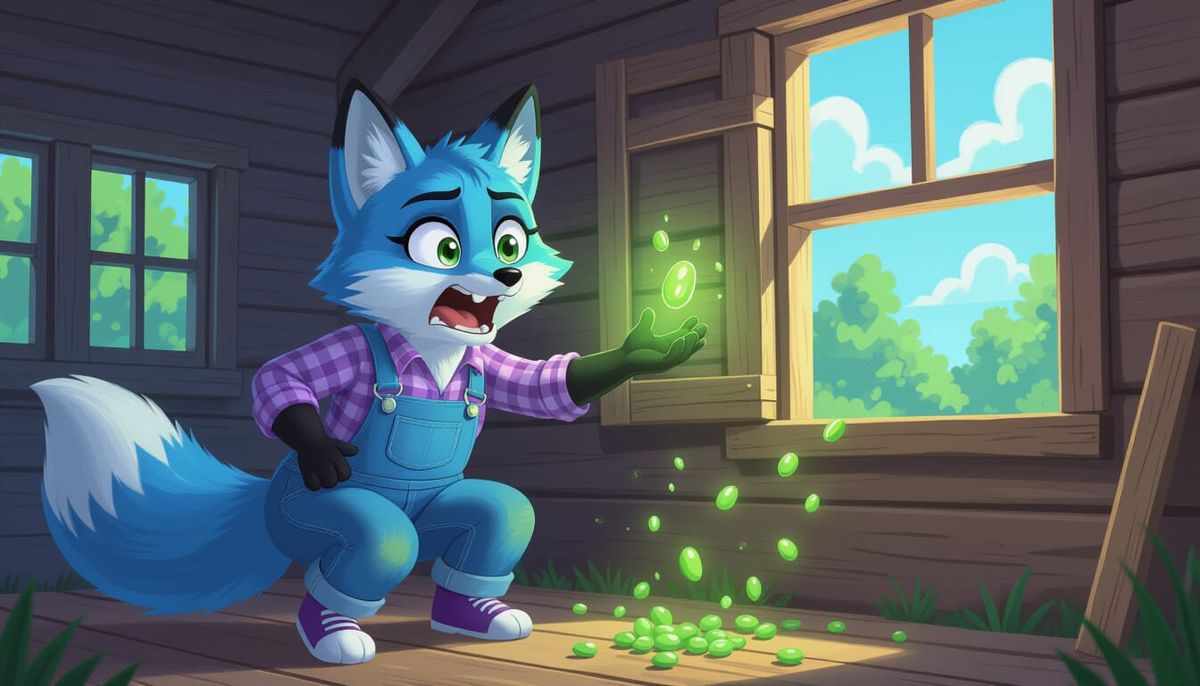 A vibrant image of a blue fox mother tossing a glowing seed into a wooden house. The fox, dressed in overalls, displays a shocked expression, rendered with a whimsical, dreamy aesthetic.