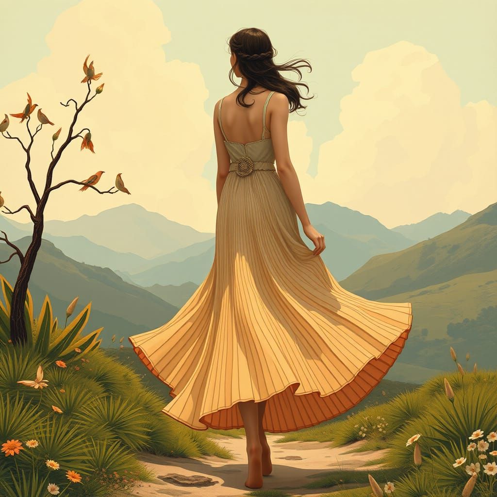 This image depicts a woman in a flowing pleated skirt wandering through a peaceful landscape. It features intricate details and a soft, dreamy aesthetic.
