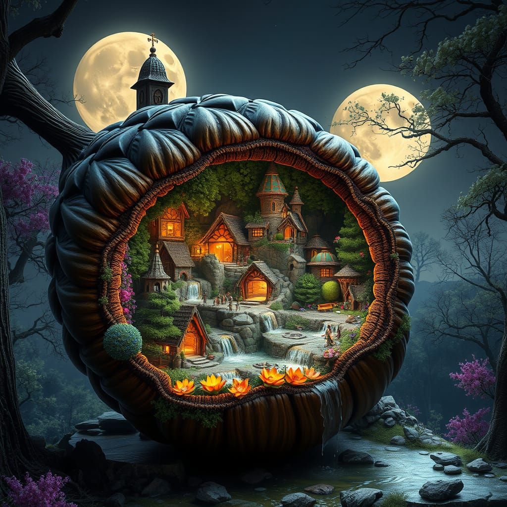 A detailed image of a miniature fairy village nestled inside an acorn. A waterfall flows through the village, set against a full moon backdrop. The image is rendered with triadic colors.