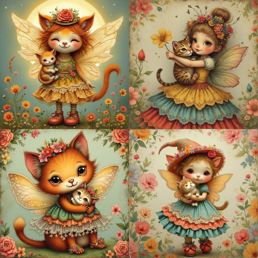 This enchanting image features a mountain lion fairy embracing a kitten, both dressed in colorful attire amidst a vibrant floral backdrop, blending elements of folk art and collage techniques.