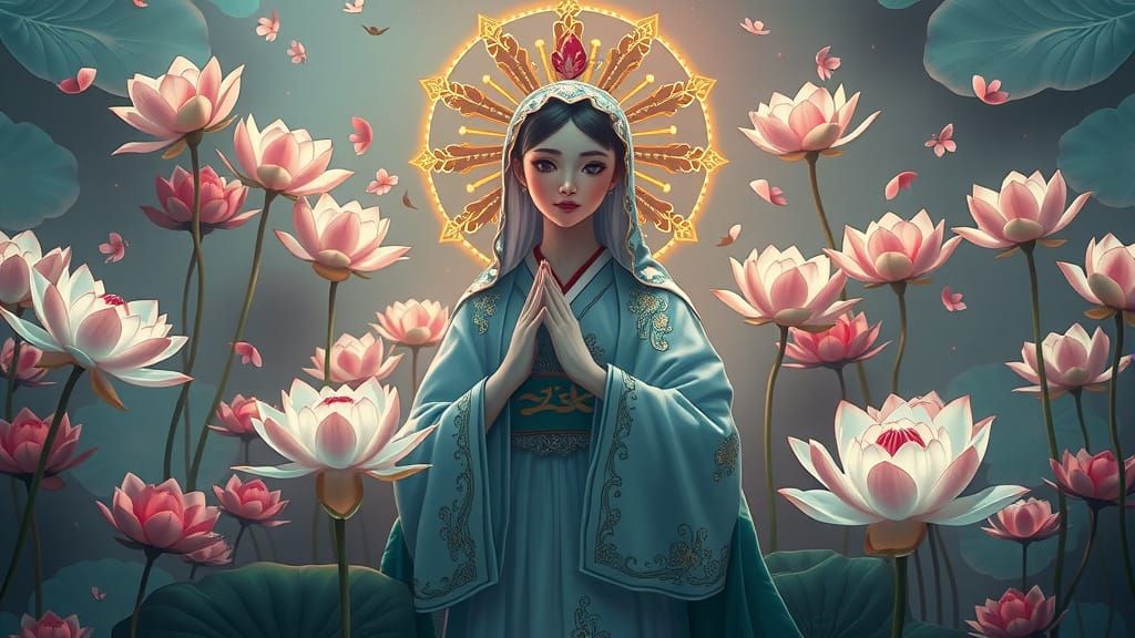 This image shows a serene Virgin Mary surrounded by lotus flowers in a mystical Japanese setting, dressed in traditional attire, amidst intricate details and deep, complementary colors, reminiscent of detailed painting techniques.