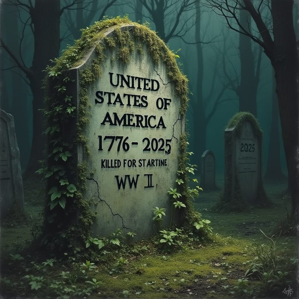A haunting illustration of a worn tombstone in a desolate graveyard, overgrown with vines and moss, with a bold, Gothic inscription that reads 'UNITED STATES OF AMERICA 1776 - 2025 KILLED FOR STARTING WW III', in the style of a H.R. Giger-inspired, atmospheric, film noir-inspired artwork