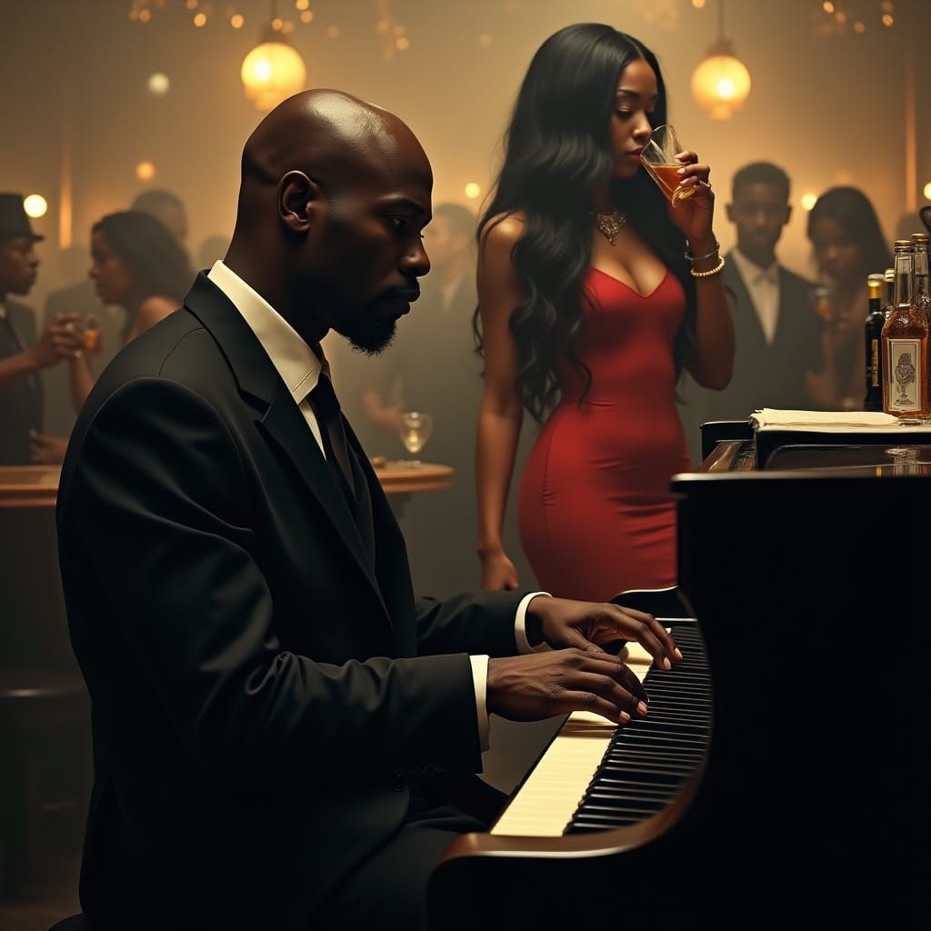 A striking picture of a bald black man in a suit playing piano in a smoky bar. A woman in a red dress sips a drink in the background, all rendered in a film noir aesthetic.