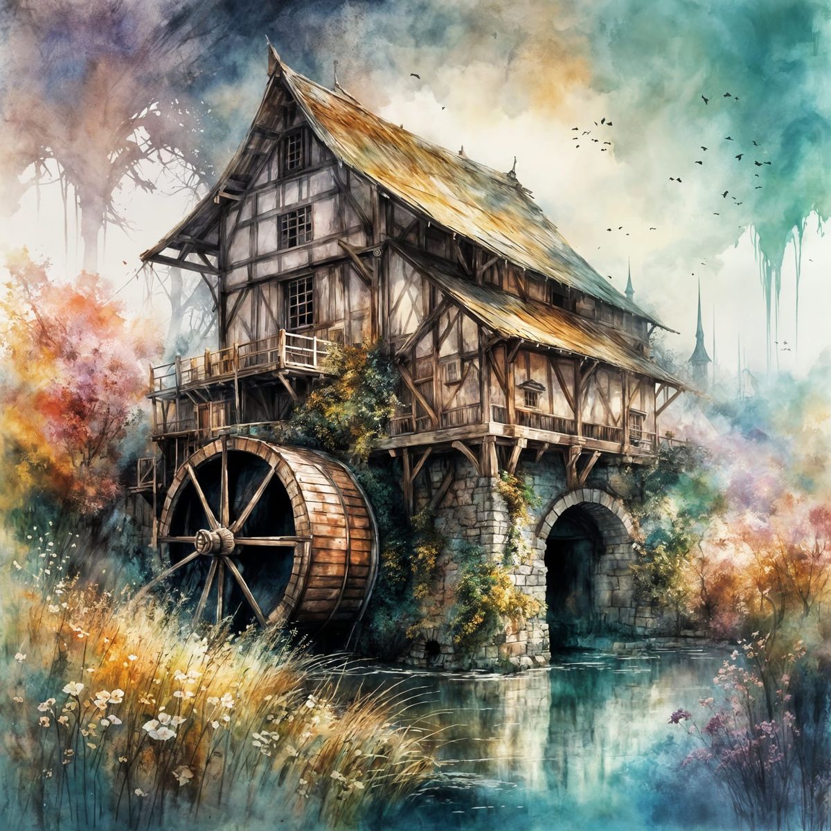 This image is a beautiful representation of a medieval watermill, rendered in pastel watercolor with intricate details and complex contrast, evoking a sense of cinematic grandeur and volumetric lighting.