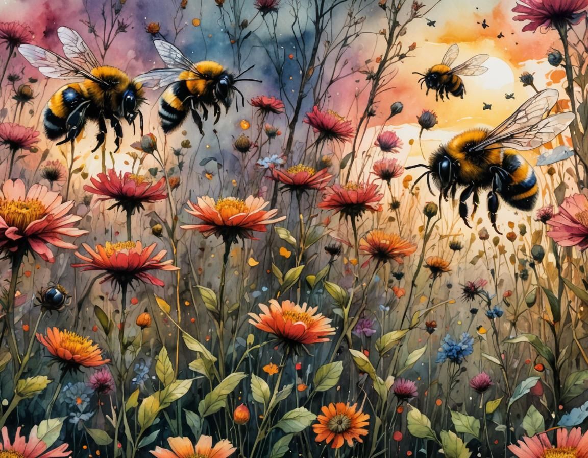 A watercolor illustration of bumblebees flying during a vibrant sunset over a field of flowers and apple trees. The artwork features intricate details and cinematic lighting.