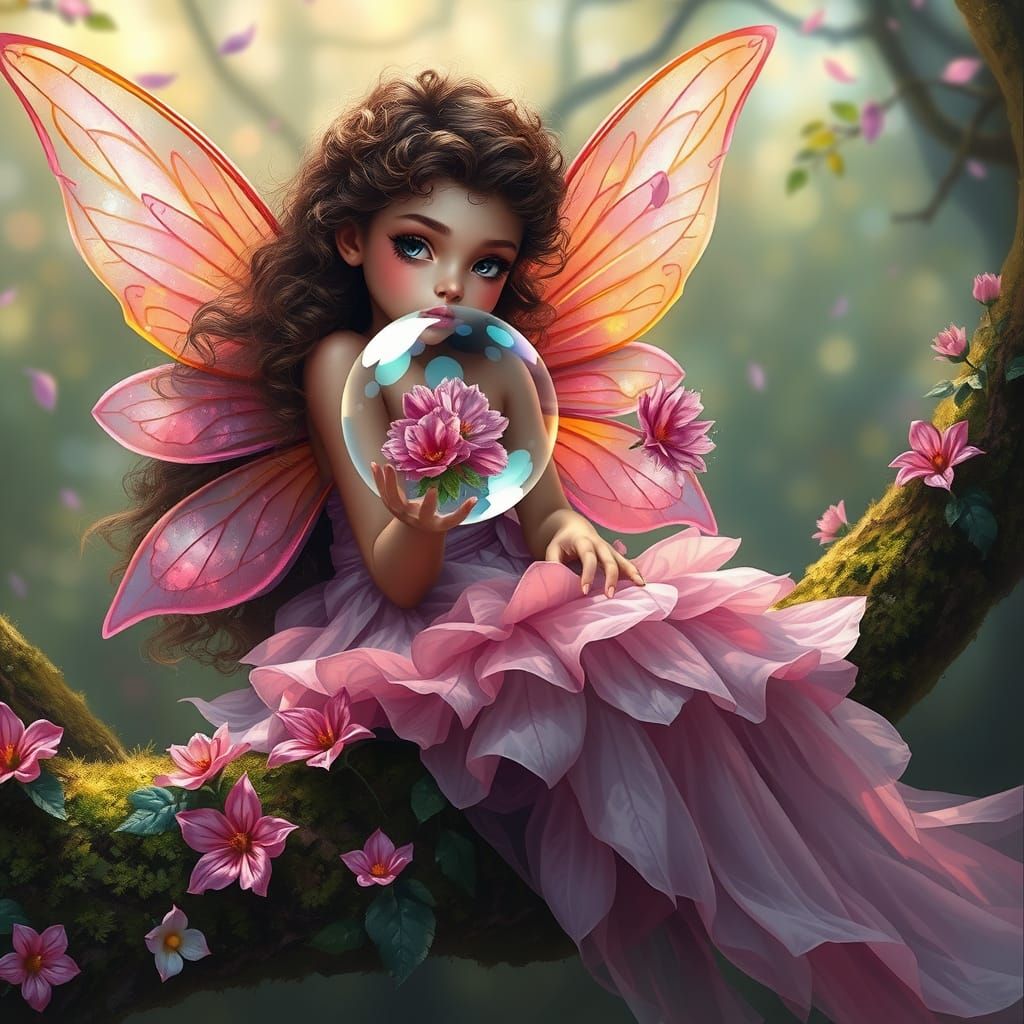 Digital oil painting, brilliant, a beautiful young fairy, colorful with long hair and beautiful wings, and exaggerated, colorful and glossy makeup, is sitting on a tree branch adorned with colorful iridescent flowers and green moss, the fairy blows large, crystalline colorful bubbles that carry beautiful ...