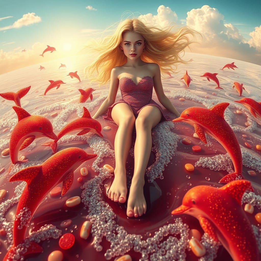 A whimsical picture of a golden-haired woman floating on a soda sea. Gummy candy dolphins and hard sweets surround her in this dreamlike image with vibrant colors and delicate textures.