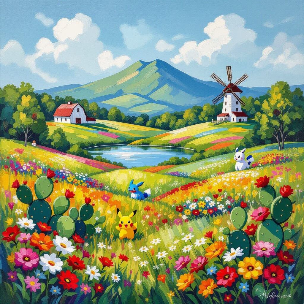 A vibrant oil painting of a colorful landscape subtly populated with Pokemon. Rolling hills, flowers, and cacti fill the foreground, leading to a wooded area with a barn and pond.