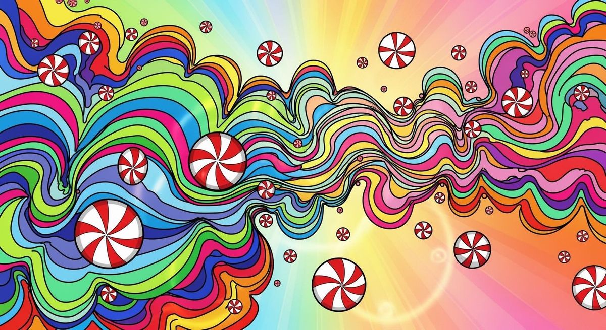 This image shows vibrant op-art swirls of incense smoke and peppermint candies. Rendered in bold outlines with clashing neon colors, it evokes a dreamlike, surreal atmosphere.
