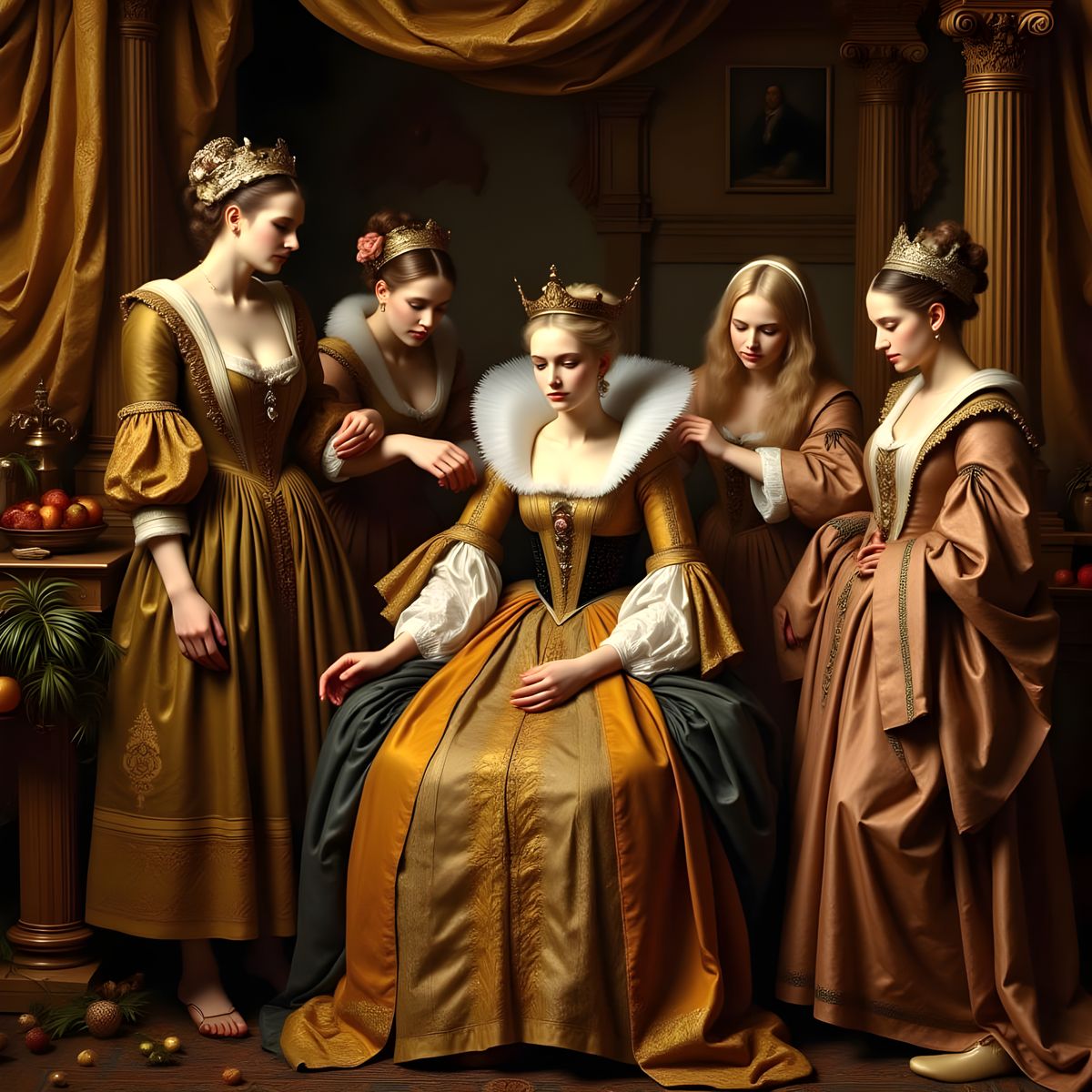 This image shows servants attending to a queen in preparation for her coronation. The artwork is reminiscent of Renaissance paintings, employing chiaroscuro and rich colors.
