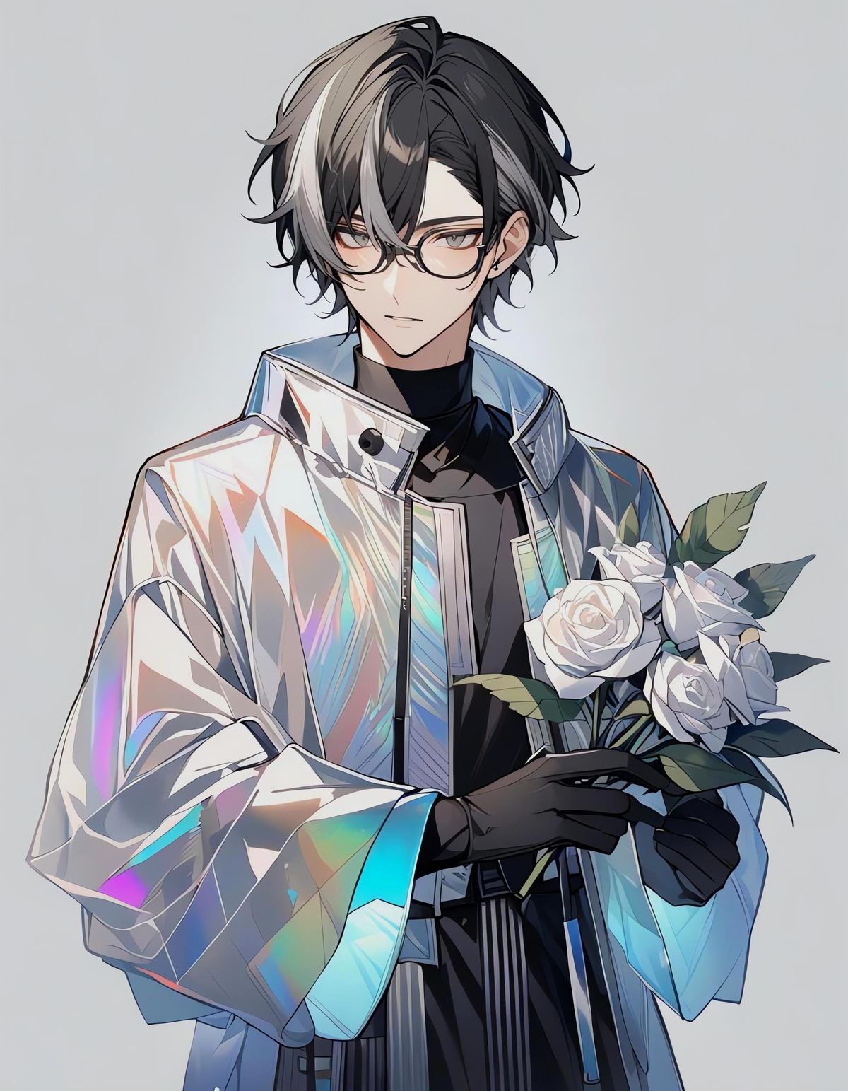 This image shows a lone, handsome young man with black and gray hair, wearing an iridescent jacket and glasses. He holds a white rose against a simple gray backdrop.