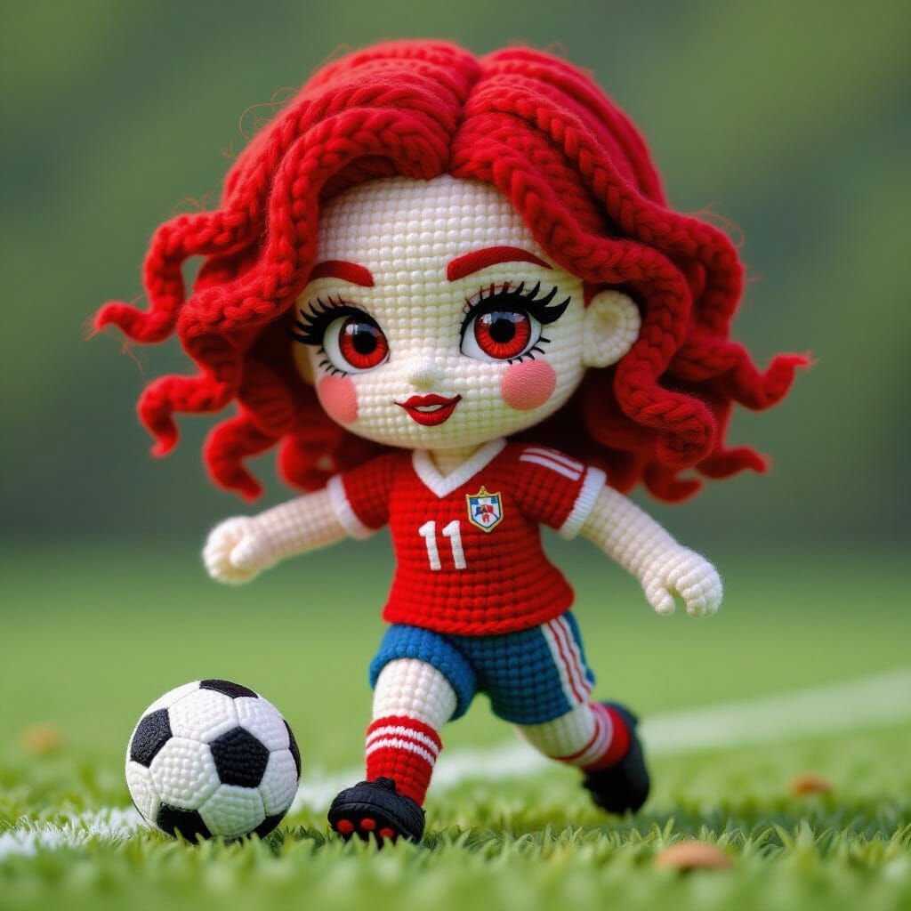 This image shows a cute chibi vampire woman made entirely of colored yarn, chasing a soccer ball. The kawaii 3D composition features a young woman with wavy red hair and crimson eyes.