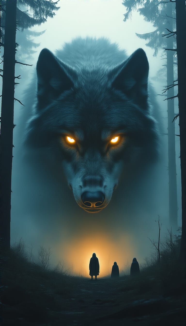 A colossal wolf's glowing eyes dominate a dark, misty forest as tiny gods cower. This image captures a mystical, cinematic atmosphere with biomechanical details and dramatic lighting.