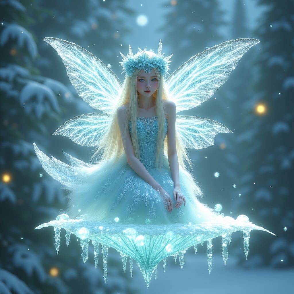 A delicate winter fairy with silvery hair sits on a glowing snowflake. Her icy-blue dress and frost crown shimmer in the moonlight, surrounded by luminescent snowflakes and crystal droplets.