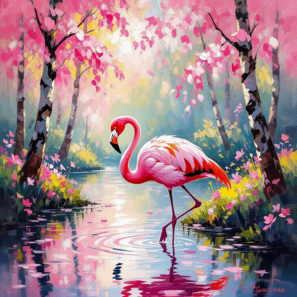 A vibrant impressionist painting showcasing a pink flamingo in a magical forest. Textured brushstrokes and dappled light capture the beauty of pink flora in an impasto style.