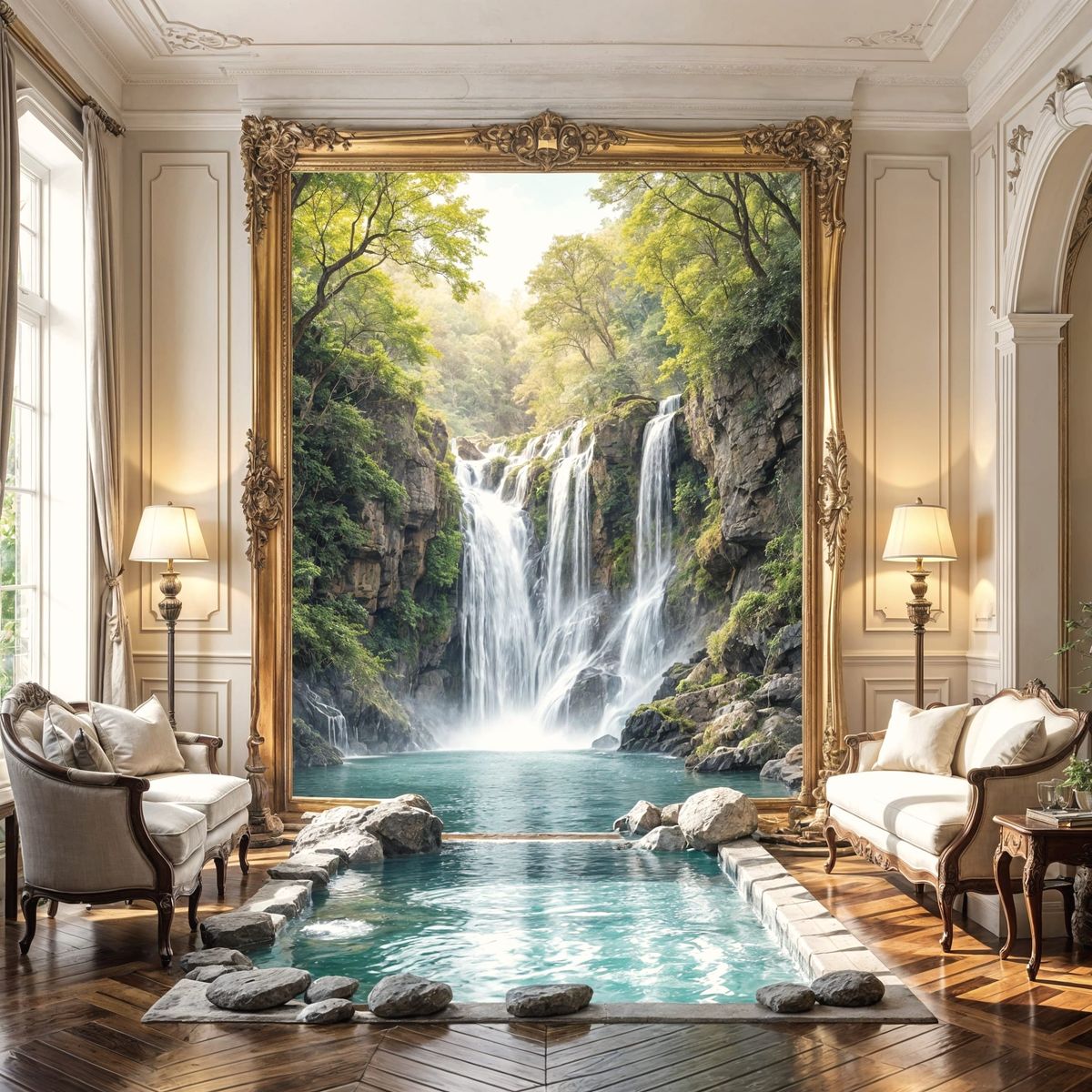 This image shows a classical living room where nature and interior design blend seamlessly. It features a hyperrealistic waterfall scene inside a golden picture frame, merging with an indoor pool in a magical realism style.