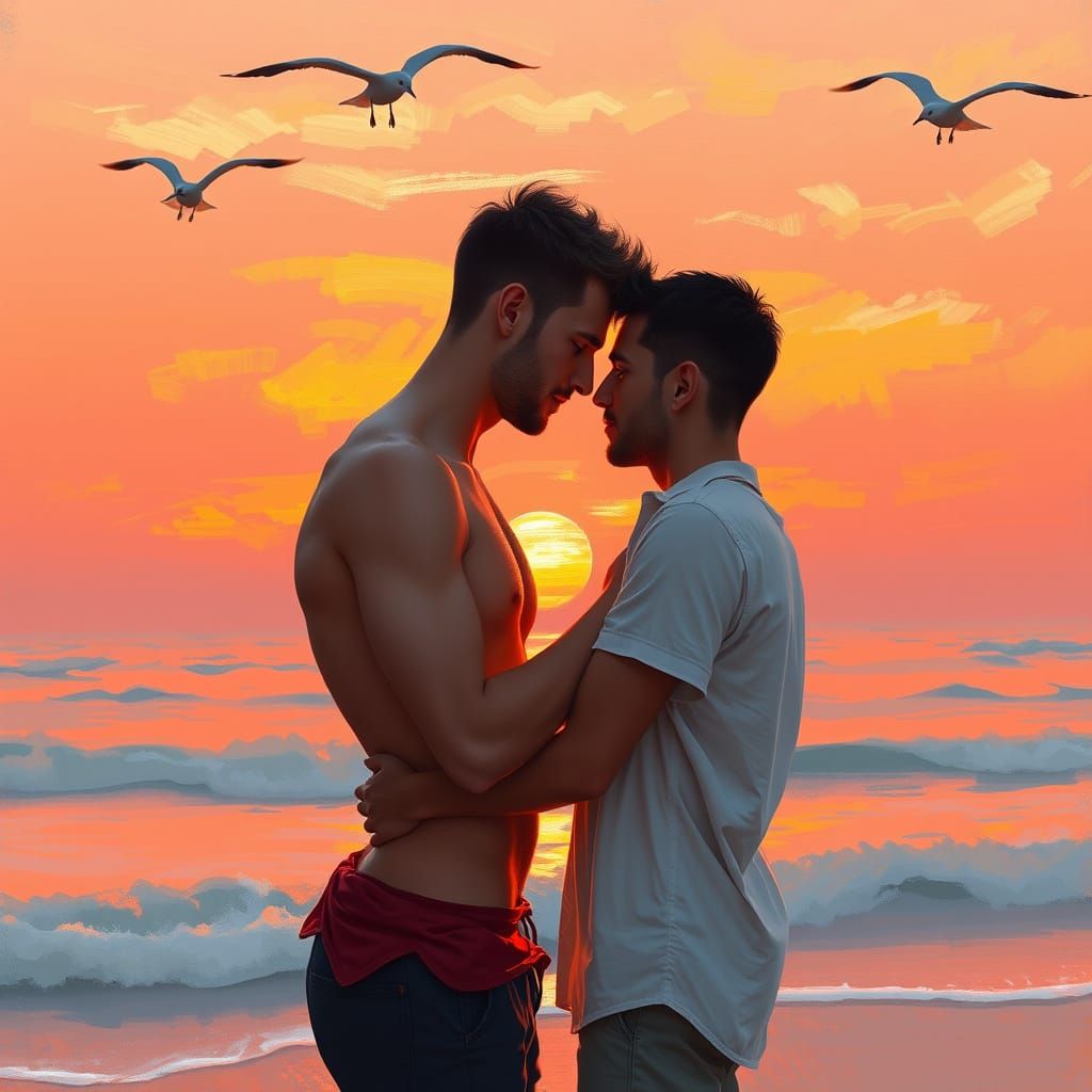 This image shows a gay couple embracing on a beach at sunset. The scene evokes a peaceful, warm atmosphere. The style is reminiscent of impressionist paintings, with soft brushstrokes.