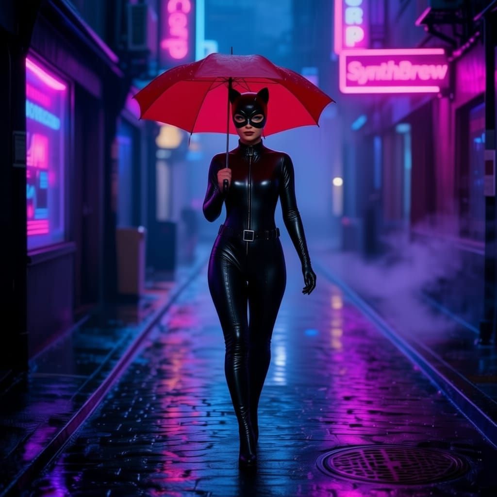 A lone figure with an umbrella walks through a rainy, neon-lit alleyway. Holographic ads and rising steam create a moody, neo-noir atmosphere, depicted with deep blues, purples, and pinks.