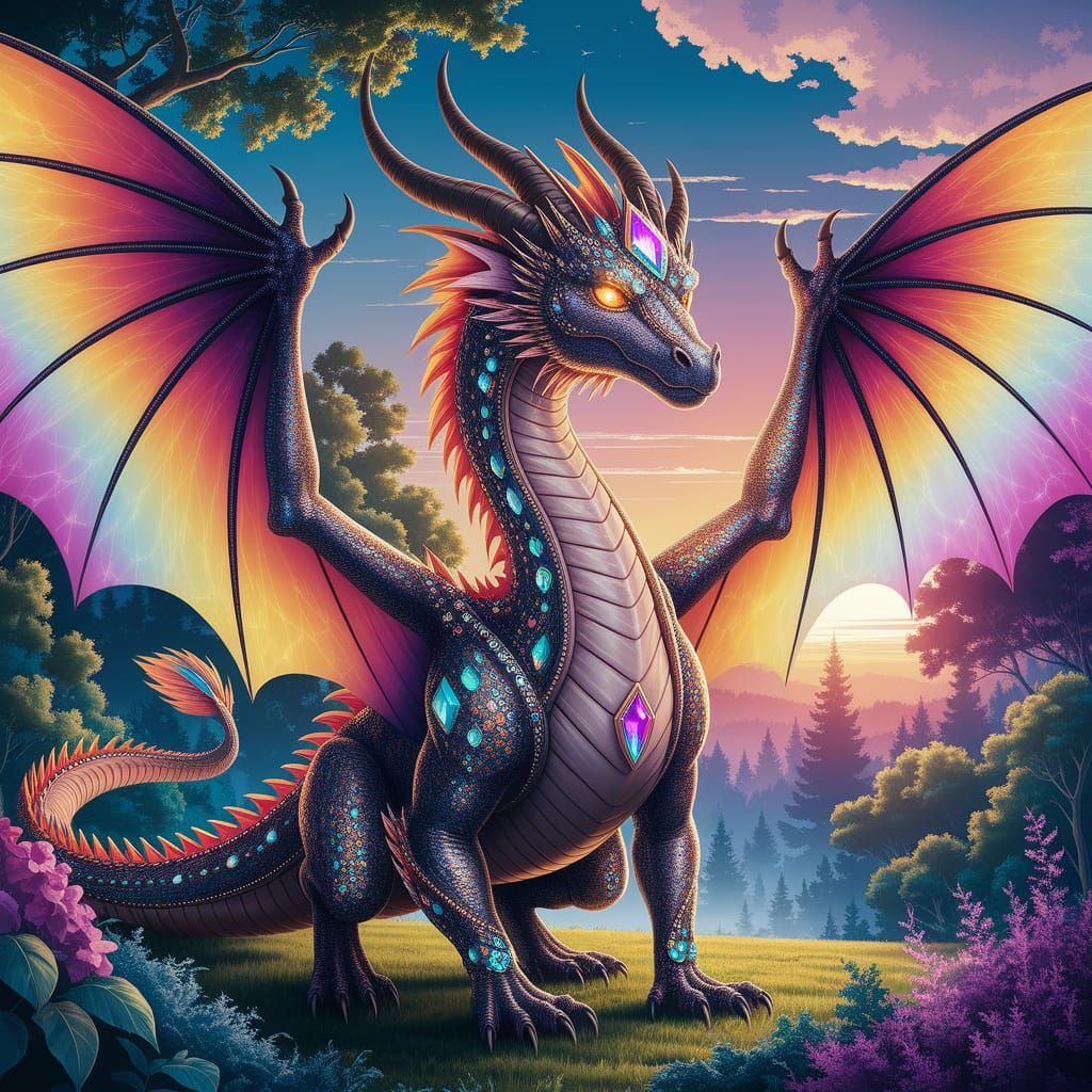 A breathtaking image of a jeweled Zittino King Dragon in an enchanted forest. The dragon's iridescent wings cast a golden hue as it basks in the setting sun.