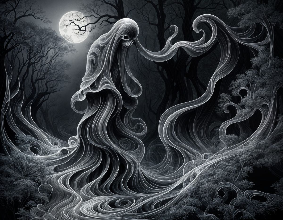 This image is a mystical representation of a ghostly presence amidst a twisted, spiraling woodscape, created using abstract vector fractal techniques and 3D shading, reminiscent of a hyperdetailed charcoal drawing.