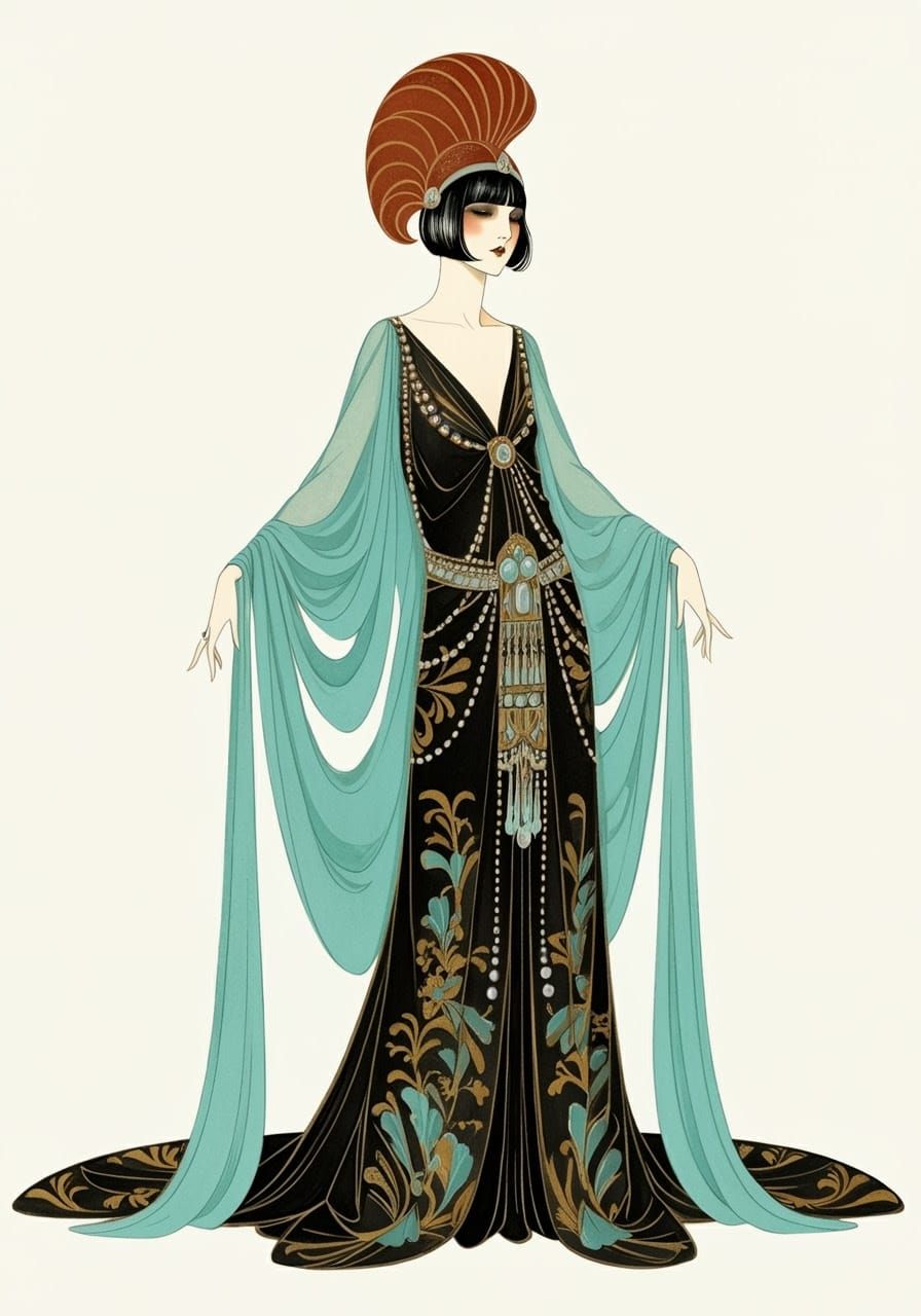 A digital illustration of a woman in an opulent Art Deco-era gown with golden floral accents and a dramatic feathered train. Turquoise panels and an elaborate headdress complete the 1920s glamour.