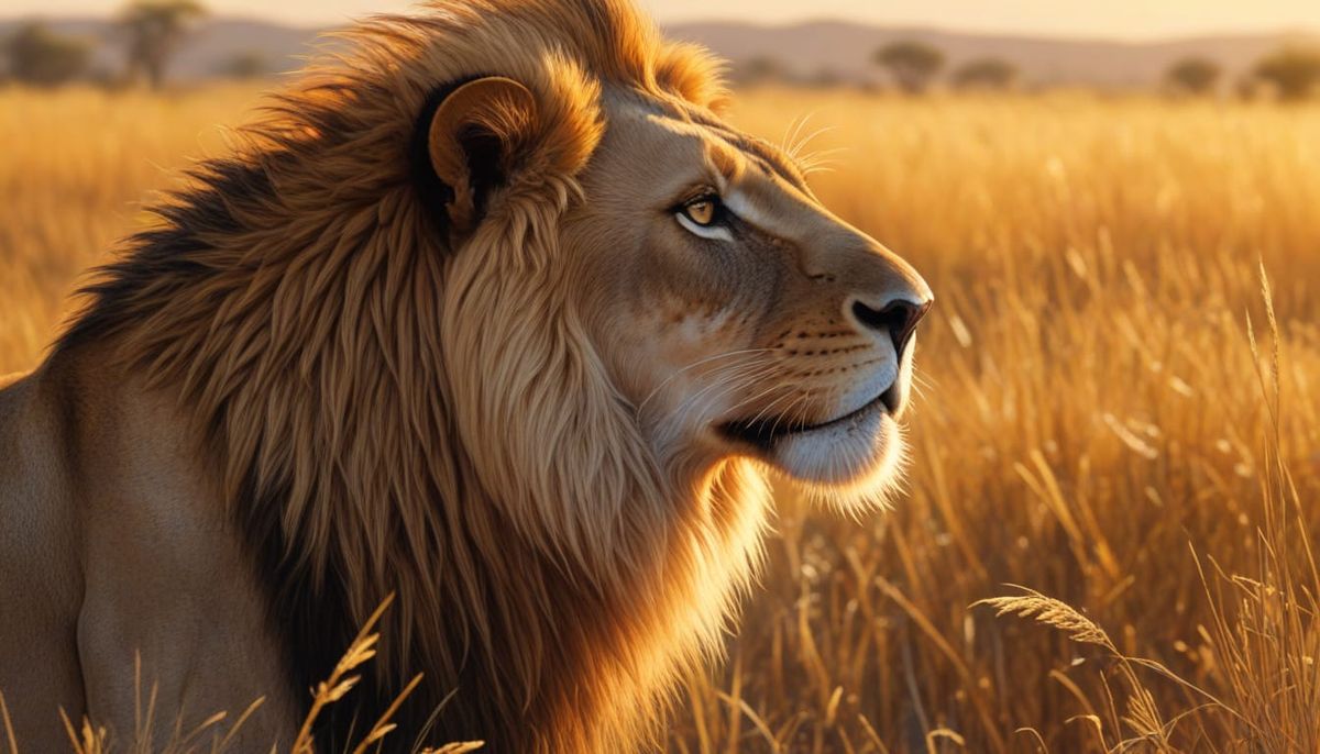 This oil painting captures a majestic lion with a shimmering mane, surveying the vast savannah during golden hour. Realistic wildlife art with vibrant colors and naturalistic lighting.