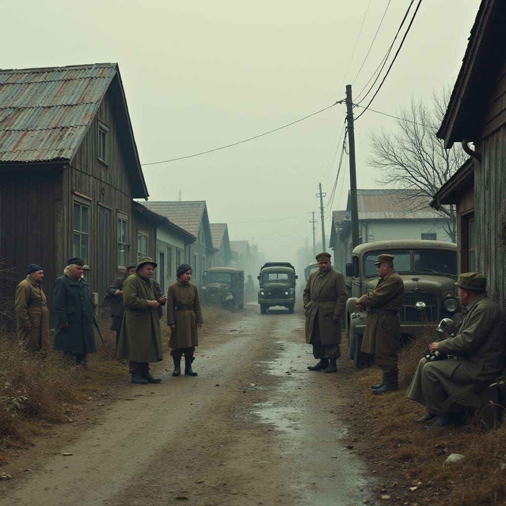 This image depicts a Ukrainian village under occupation during World War II, with a group of villagers showing resilience and determination as they stand near their traditional homes, surrounded by Soviet military presence and oppression.