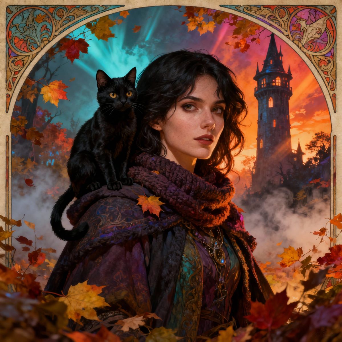A detailed portrait of a brunette wizard woman in mystical attire with a black cat, set against a spooky tower and fall foliage. Features vibrant colors and ornate details.