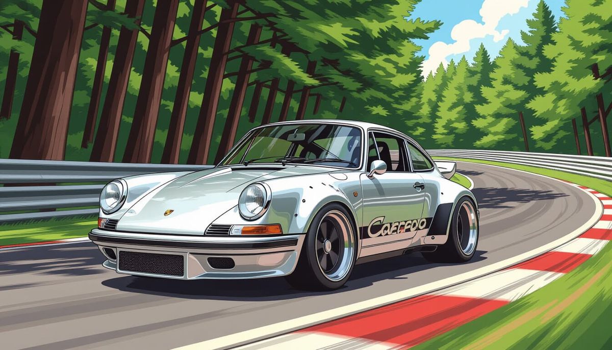 A striking picture of a vintage Porsche 911 entering a curve on a race track. The car is rendered in a hand-drawn color comic art style, with dynamic lines and vivid colors, reminiscent of classic comic book illustrations.