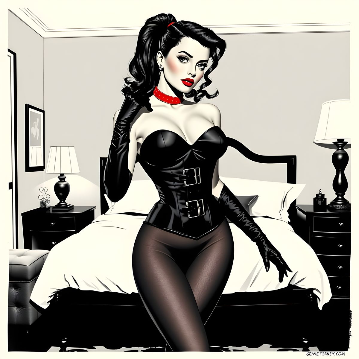 A striking picture of a woman in a black PVC corset, red lipstick and stiletto heels, channeling a classic femme fatale aesthetic in a monochrome bedroom.