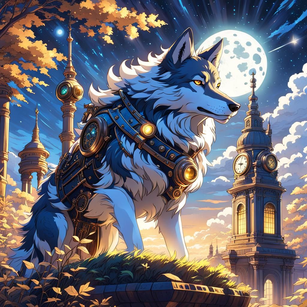 A steampunk-inspired wolf beneath a starlit sky and full moon, set against ancient Roman architecture. The artwork resembles a Studio Ghibli anime key visual with deep colors and intricate details.