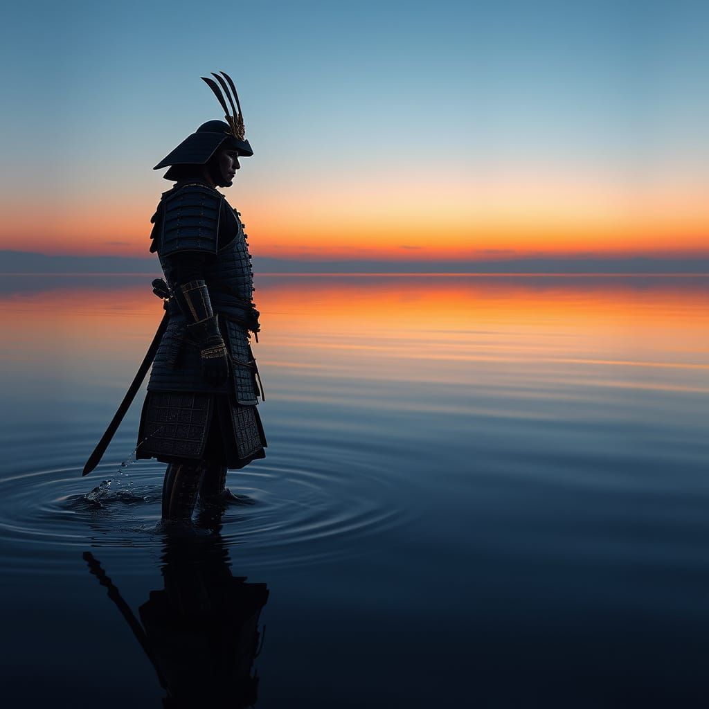 A lone samurai warrior stands in a tranquil lake at dusk, reflected in the water. The image captures realistic textures and subtle details, reminiscent of rich oil paintings.
