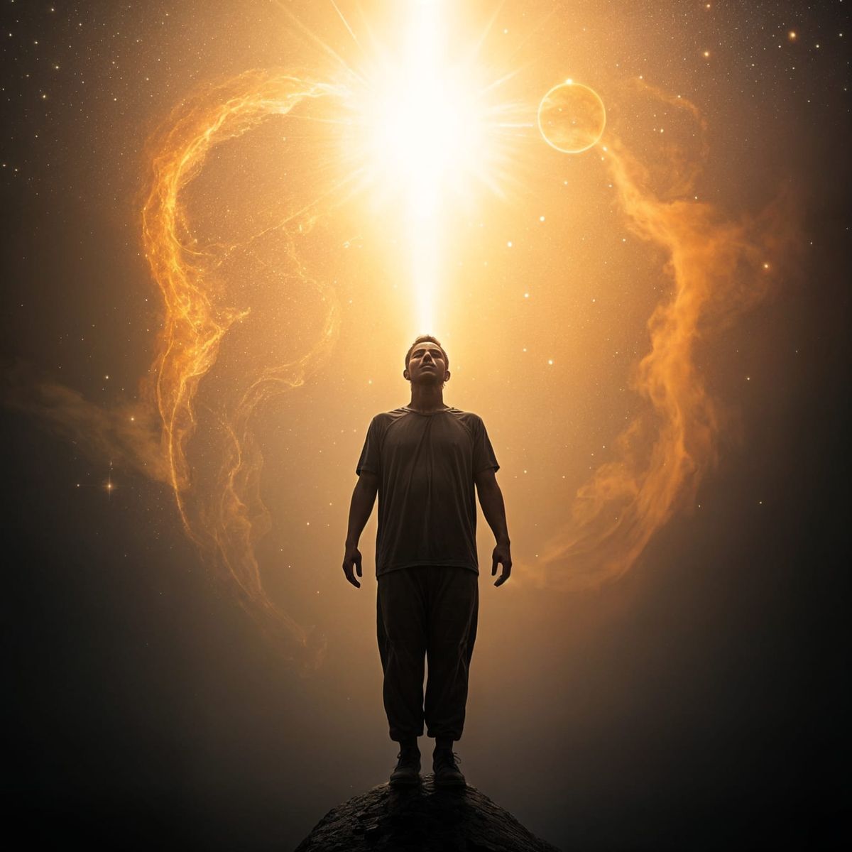 This image captures a moment of profound awareness, as a lone figure is illuminated by a radiant light that breaks through the boundaries of perception. Reality shifts around him, with memories, emotions, and visions swirling in perfect harmony, evoking the surrealist and abstract expressionist movements...
