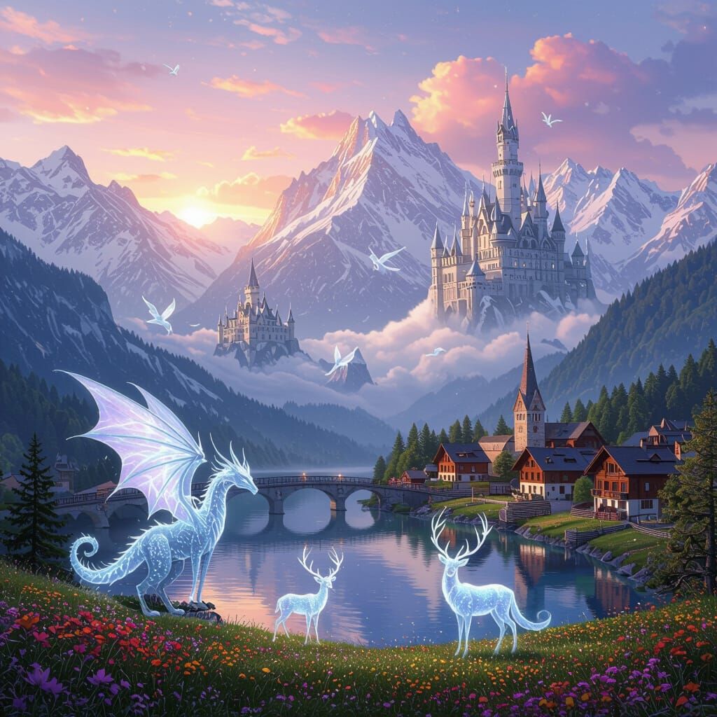 This image showcases a fantasy landscape of the Swiss Alps at dawn, featuring floating castles, ice dragons, and glowing mountains, rendered in a detailed digital matte painting style with vibrant colors.