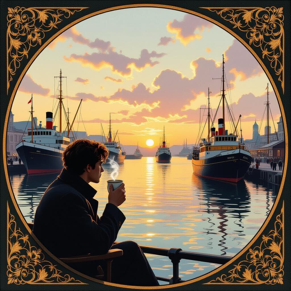 A realistic depiction of a port city at dawn, featuring silhouetted ships under a pastel sky. This scene captures tranquil waters and cinematic lighting, with subtle Art Nouveau details.