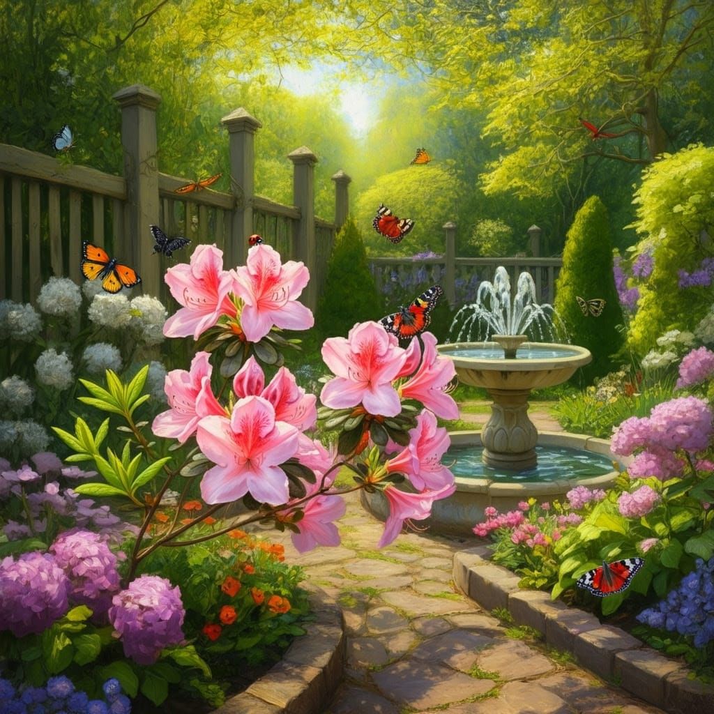 A vibrant image of a Belgian azalea in a lush garden setting, bathed in warm spring sunlight. The artwork evokes an impressionistic style with botanical art detailing.