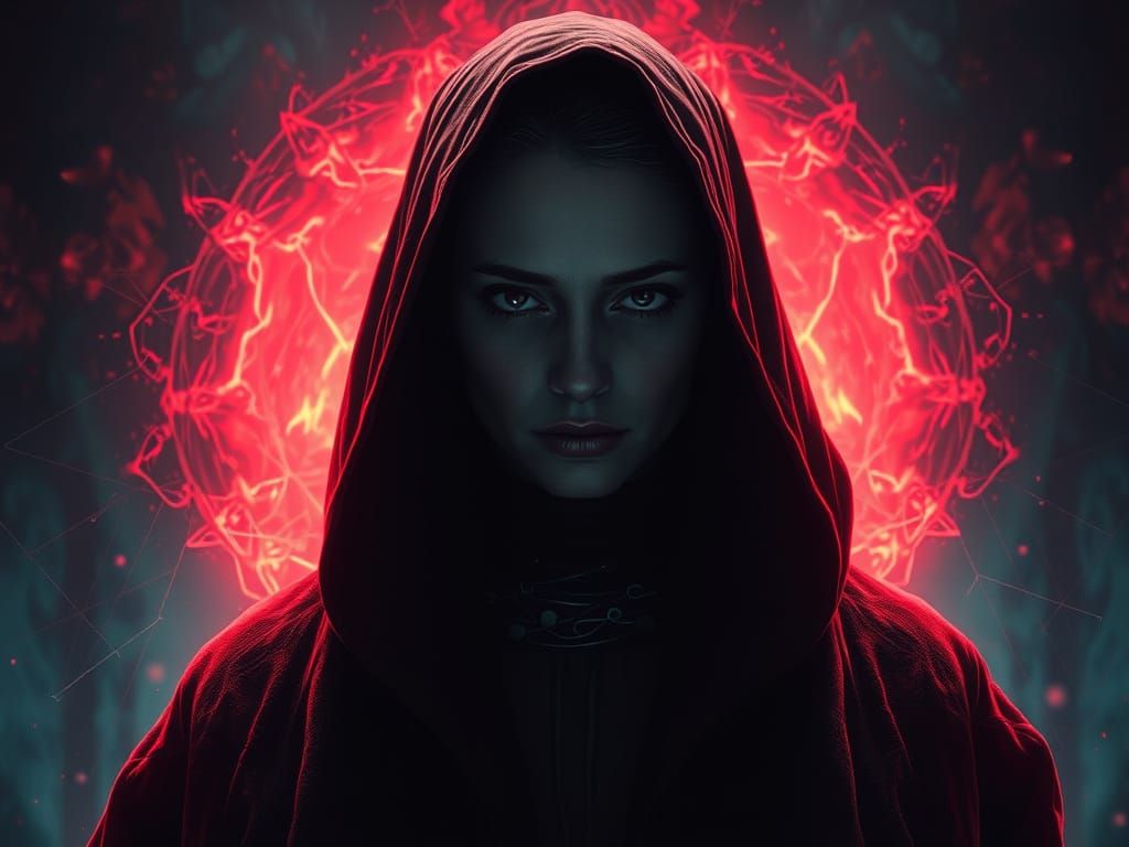 This image shows a woman in robes with an intense gaze, set against vibrant plasma gas effects. The artwork blends dark, eerie atmospheres with futuristic, high-tech aesthetics.