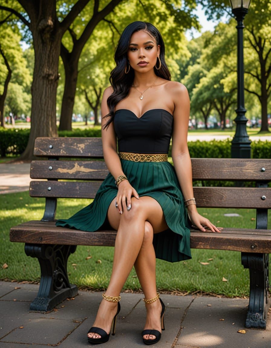 A full-body photoshoot of a 22-year-old Dominican woman with an athletic build, wearing gothic black and white clothing and platform heels. She is seated on a park bench.
